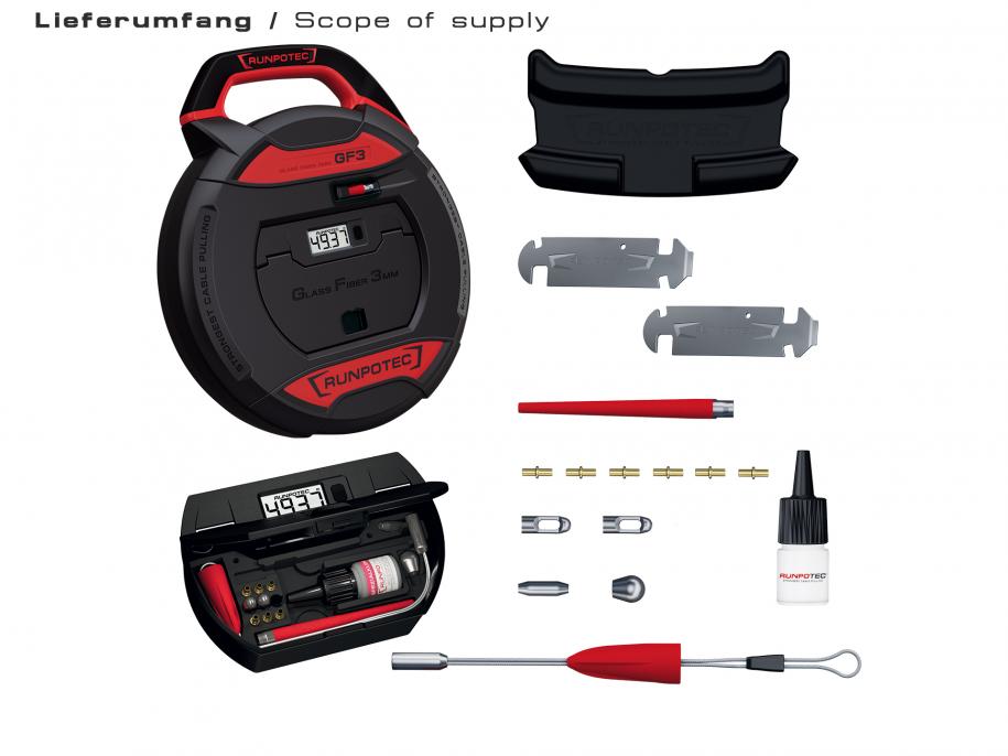 Âmbito de fornecimento: 1x câmera de inspeção RC3 (caixa incluindo monitor, cabo incluindo cabeça da câmera 15m), 1x acessório de rosca RC2/RC3, Acessório flexível, guia de fibra de vidro Ø3mm – 1 m, Micro cartão de memória 8 GB, Rosca de conexão, Ímã, gancho de pesca, cabo de carregamento USB 1,5m (USB/USB-C plug); 1x GF3 contador de metros incl. em caixa de plástico comprimento 30 m, junta de proteção de torção em ambos os lados (início /fim), conteúdo da caixa acessória: 1x cabeça de guia com ajuste de torção, 1x junta de proteção de torção RTG Ø6mm, 1x auxiliar de encaixe, 1x cola especial 3g, 1x laço de tração do cabo (Ø14mm fora), 6x pontas de reparação Ø3mm, 3 x ponta ilhó Ø7mm, 1x ponta bola Ø11mm, 1x manga de conexão, 2x chave de montagem, 1x botão de bateria CR2032