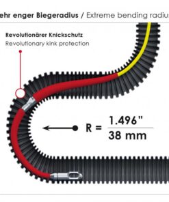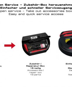 A caixa plástica GF3 pode ser aberta com apenas um parafuso para manutenção. Com uma proteção de entrada, evita que a ponta da fibra deslize acidentalmente para dentro da caixa. Além disso, a caixa possui alça de transporte ergonômica com revestimento antiderrapante. A nova tecnologia recentemente desenvolvida permite superar raios de curvatura de até R = 38 mm. A carga de ruptura total especificada de 130kg, refere-se à barra de fibra de vidro, incluindo juntas de proteção contra torções. Incluí 18 acessórios.